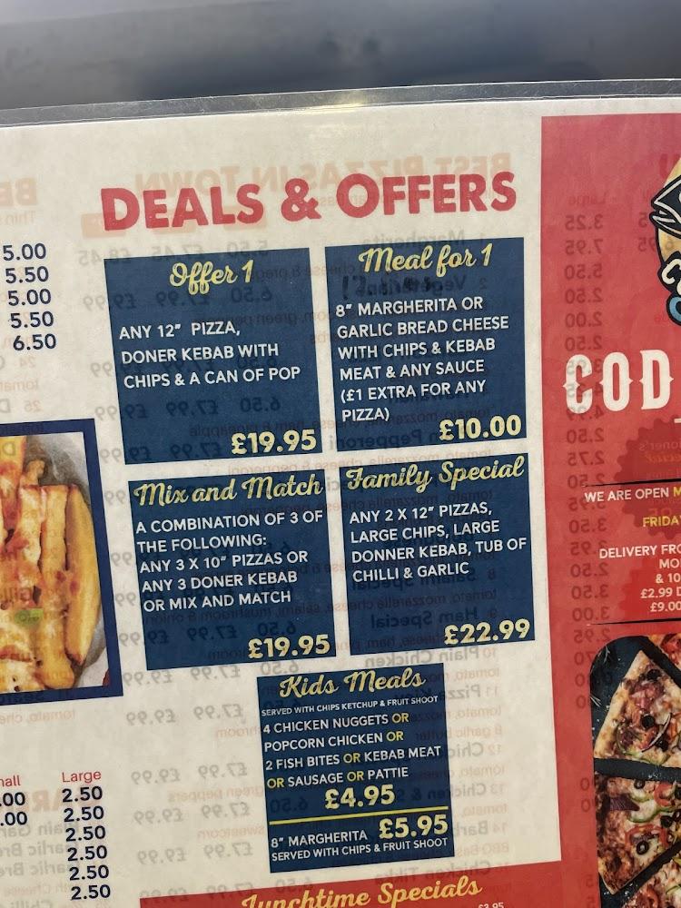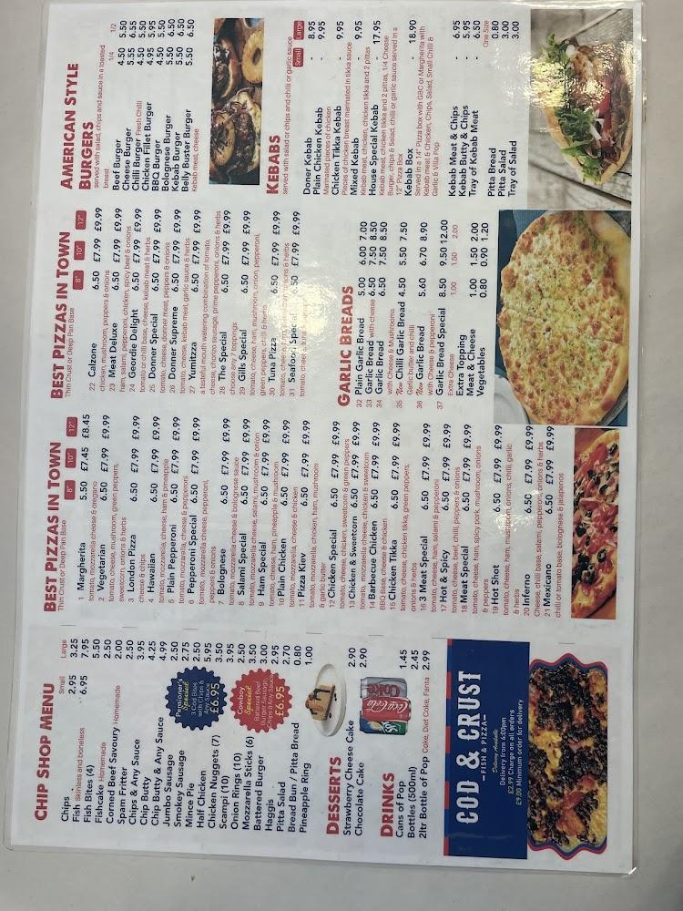 The menu at Cod & Crust is impressive and diverse, featuring over 240 items that cater to all cravings. Pizzas are among the most popular offerings, with fan favorites like the 12" Margherita and 8" Vegetarian options available. The prices range from around £8 for pizzas to just £3.69 for classic fish and chips, making it budget-friendly. The chip shop menu boasts treats like crispy battered fish, fish cakes, and traditional savory pies. Unique items such as kebabs and parmesan dishes showcase their creativity. Additionally, the kids’ menu is packed with kid-friendly delights ensuring even the little ones find something they love. With daily specials and combo offers, there's always something exciting to discover. Whether it’s for a quick lunch or a satisfying dinner, Cod & Crust offers something delicious for everyone.