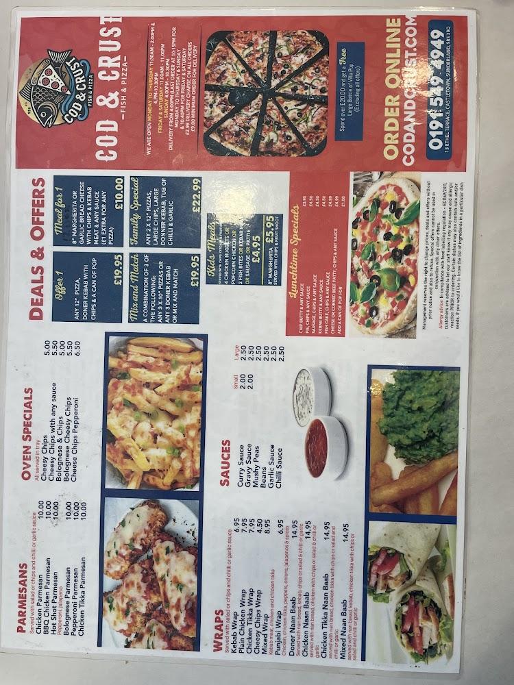 Nestled in the heart of Castletown, Sunderland, Cod & Crust stands out as a favorite among locals looking for a quick and satisfying meal. Located at 13 Ethel Terrace, this establishment boasts a welcoming vibe with a menu that caters to diverse tastes. From lunchtime cravings to dinner delights, the range of offerings makes it a go-to spot for families and individuals alike. The owners prioritize using fresh, locally sourced ingredients, which not only supports the community but also elevates the flavor profiles of their dishes. Regulars enjoy the warm atmosphere and friendly service, which have helped build a strong neighborhood presence. Open daily, Cod & Crust serves as a reliable option for those in search of delicious takeout options. Whether ordering through Just Eat, Uber Eats, or simply calling, meals are prepared with care to ensure they arrive fresh and hot. With its focus on quality and community, Cod & Crust truly embodies the spirit of Castletown.